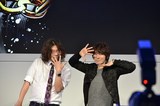 ▲バンダイナムコゲームスの新野範聰氏(左)と羽多野渉さん(右)が“ジョジョ立ち”を披露。当然会場からは大歓声が沸きまくり。フラッシュもたかれまくり。 |