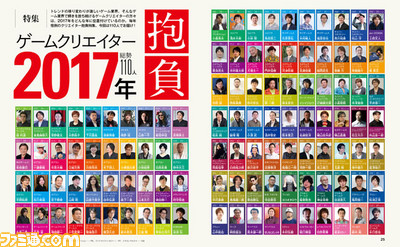 この時期の恒例企画! 週刊ファミ通2017年1月26日号(2017年1月12日発売)では、ゲームクリエイター総勢110人の新年の抱負を掲載。2017年、ゲーム業界の第一線で活躍するゲームクリエイターの方々は、何に注目し、どんな目標を立てているのか!? 本特集は2017年のゲーム業界を深読みできるヒントも満載だ。ちなみに本特集は、ファミ通.comに掲載したゲームクリエイター総勢110人にアンケート! 2017年の抱負とキーワードは?とは異なる設問もあるので、ぜひチェックしていただきたい!