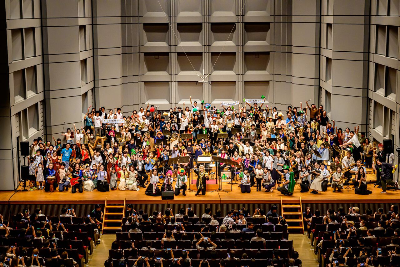 アンコールでよりいっそうの盛り上がりを見せた後、ステージには色鮮やかなアフロヘアーの山下さんと植松氏が登場。オーラスの曲は来場者が持ち寄った楽器や会場で配られたおもちゃの楽器を使って演奏された『マンボ de チョコボ』。ステージを文字通り埋め尽くす演奏者たちと客席でいっせいに振られるマラカスによる大合奏は、冒頭に植松氏が述べた“演奏者たちと観客がいっしょになって大騒ぎするイベント”という表現をまさに体現するものとなった。