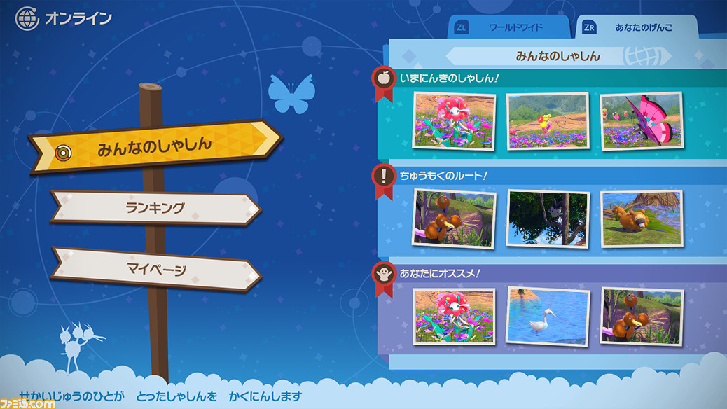 『New ポケモンスナップ』には、いくつかのオンライン機能が実装されている。世界中の人とスコアを競い合えるランキングシステムのほか、写真の共有も楽しめるぞ。