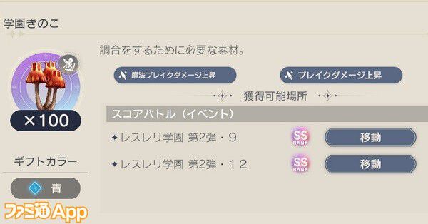 それが、魔法ブレイクダメージ上昇/ブレイクダメージ上昇の特性を持つ学園きのこ。イベントステージでドロップするため必然的に大量に集まりますが、学園うにと同じく確保しておきたい素材です。