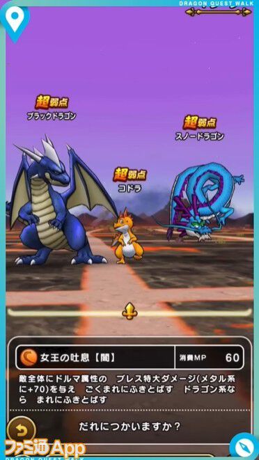 ∟女王の吐息【闇】・・・敵全体にドルマ属性のブレス特大ダメージ(メタル系には70ダメージ)与え、ごくまれに吹き飛ばす。ドラゴン系はまれに吹き飛ばす