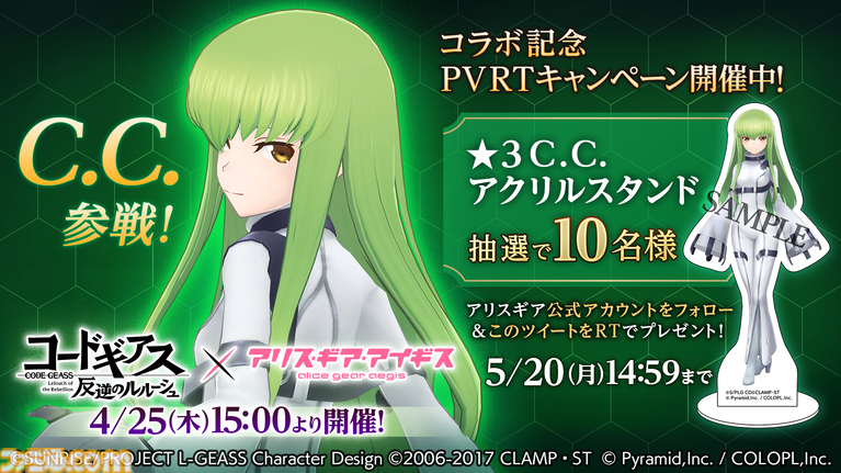 「C.C.」と「紅月 カレン」のPV公開にあわせて、それぞれTwitterキャンペーンを実施中です。