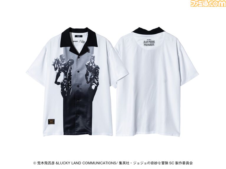 気高い騎士道精神を持つポルナレフの姿をオープンカラーシャツに乗せたJean Pierre Polnareff Shirt。モードなモノトーンの配色はキャラクターのカラーリングを反映したもの。オールドアメリカンのヴィンテージシャツに見られる荒々しい筆遣いのタッチで、宿敵J・ガイルに挑むポルナレフの闘志を表現しました。