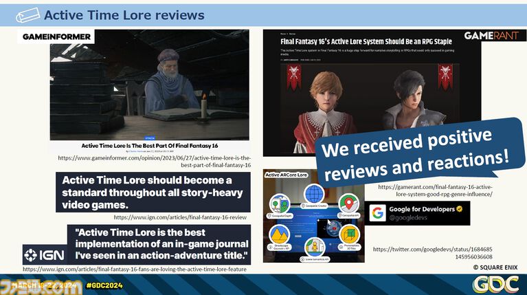 背景のロアを理解することはストーリーをさらにおもしろくし、忙しい日常の合間でゲームをプレイする場合でも、アクティブタイムロアのような機能はそれを可能にする。ロアはゲームの重要な要素のひとつであり、いい形でロアを紹介することは、プレイヤーの体験を向上させるはずだと、青野氏は語り、本講演のまとめとした。