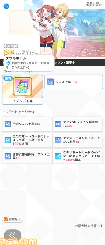 “SR どりゃぎゃ”も、サポートイベントでPアイテムを獲得するタイプのカード。入手できる“ダブルボトル”は好調効果がついたカードを獲得時にダンスのパラメータを上げられるので、ダンス特化での育成で非常に役立ってくれそうだ。SPレッスン発生率上昇を持っているのもありがたい。ただし、性能が好調に絡むもののため編成はセンス限定ということはご注意いただきたい。