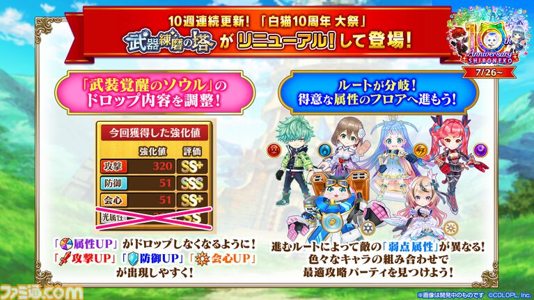 “武器練磨の塔”のリニューアルも告知された。“武装覚醒のソウル”のドロップ内容に調整が入り、属性UPがドロップしなくなるとのこと。
