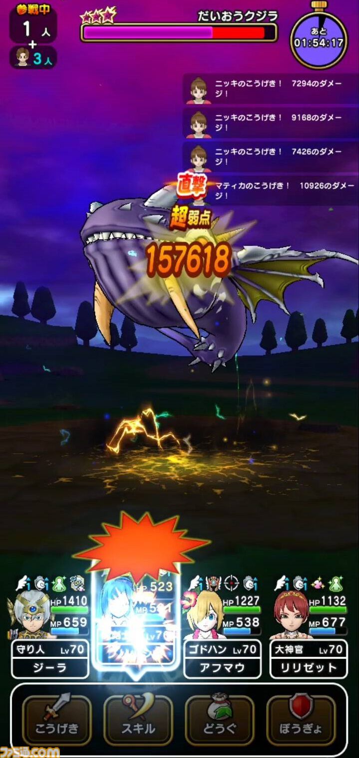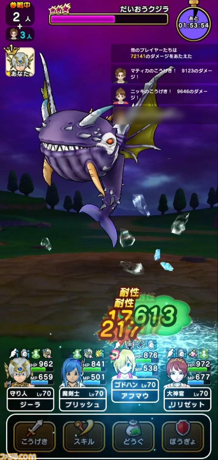 見た目に満足したところで、イベント同時に出現した新メガモンスター・だいおうクジラについて。ヒャド、イオ属性が弱点で、デイン属性には若干耐性を持っているようです。しかし、多少の耐性ならばギガブレードでぶち抜けるんじゃないか? と思ったのでラーミア、バラモスと同じく“きあいため”や“おうえん”を使ったギガブレードを試してみました。それに加え、今回はちょっとした戦術も組み込んでいます。パーティはこんな感じ。