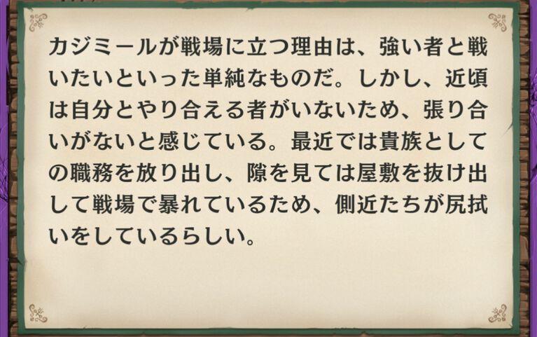 さてそんなカジミールですが、武勲によって爵位を与えられたという背景が。貴族は世襲制のイメージが強いこともあり、戦果だけで成り上がっているのはかなり異例な印象です。ただ本人は立場にこだわりはなく、趣味嗜好から戦場にガンガン出たがるタイプとなっています。