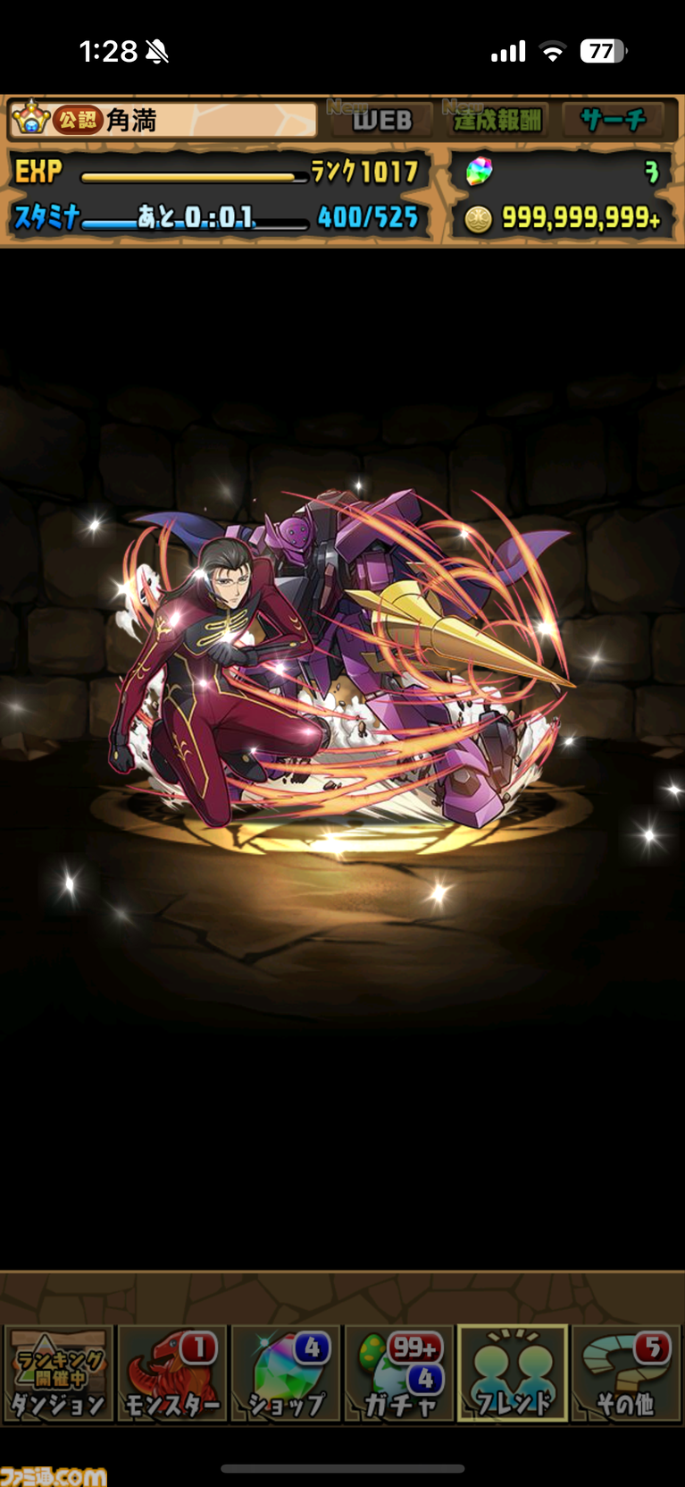 ってことでここから、クリアー報酬としてコードギアスコラボガチャの権利がもらえるダンジョン制覇が始まるのである。ざっと、ナイトオブクラウンズLv5、シャルル&マリアンヌ降臨、コードギアスコロシアム、コードギアスダンジョン初級、そしてログインスタンプいくつかと、スー☆選手チャレンジ企画報酬……あたりかな。それプラス、未クリアーダンジョン(8月のクエスト含むw)を制してかき集めた魔法石を使って、合計で……まだ13回も回せた!!!ww ってことで、今回で一気に決着をつけたいと思います!!