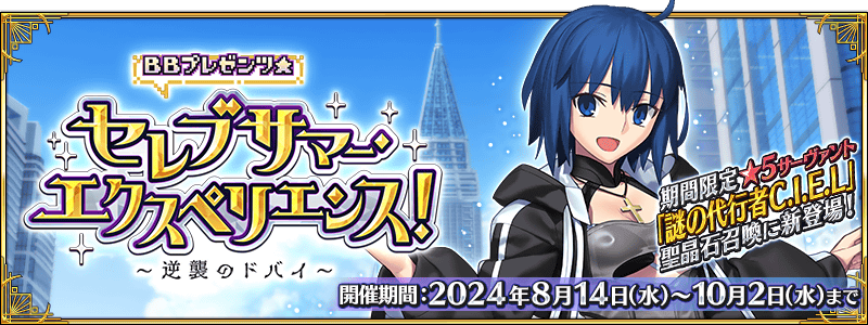 FGO PROJECT(有限会社ノーツ、株式会社アニプレックス、株式会社ラセングル)は、期間限定イベント「BBプレゼンツ☆セレブサマー・エクスペリエンス! ~逆襲のドバイ~」を 2024年8月14日(水)20:00から10月2日(水)12:59までの50日間開催いたします。さらに、同期間「BBプレゼンツ☆セレブサマー・エクスペリエンス! 謎の代行者 C.I.E.L ピックアップ召喚」、「BBプレゼンツ☆セレブサマー・エクスペリエンス! カルナピックアップ召喚」を開催いたします。本情報は、本日2024年8月14日(水)に配信した「Fate/Grand Order カルデア放送局 ライト版 ~水着イベント2024~」(以下、本番組)にて発表いたしました。
