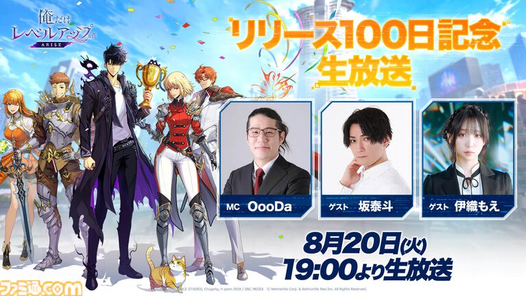 ネットマーブルより配信中の『俺だけレベルアップな件:ARISE』にて、リリース100日を記念した生放送が2024年8月20日19時より実施される。本放送では、水篠旬 役の坂泰斗さんと伊織もえさんをゲストに迎え、大型アップデート情報などが届けられる予定だ。
