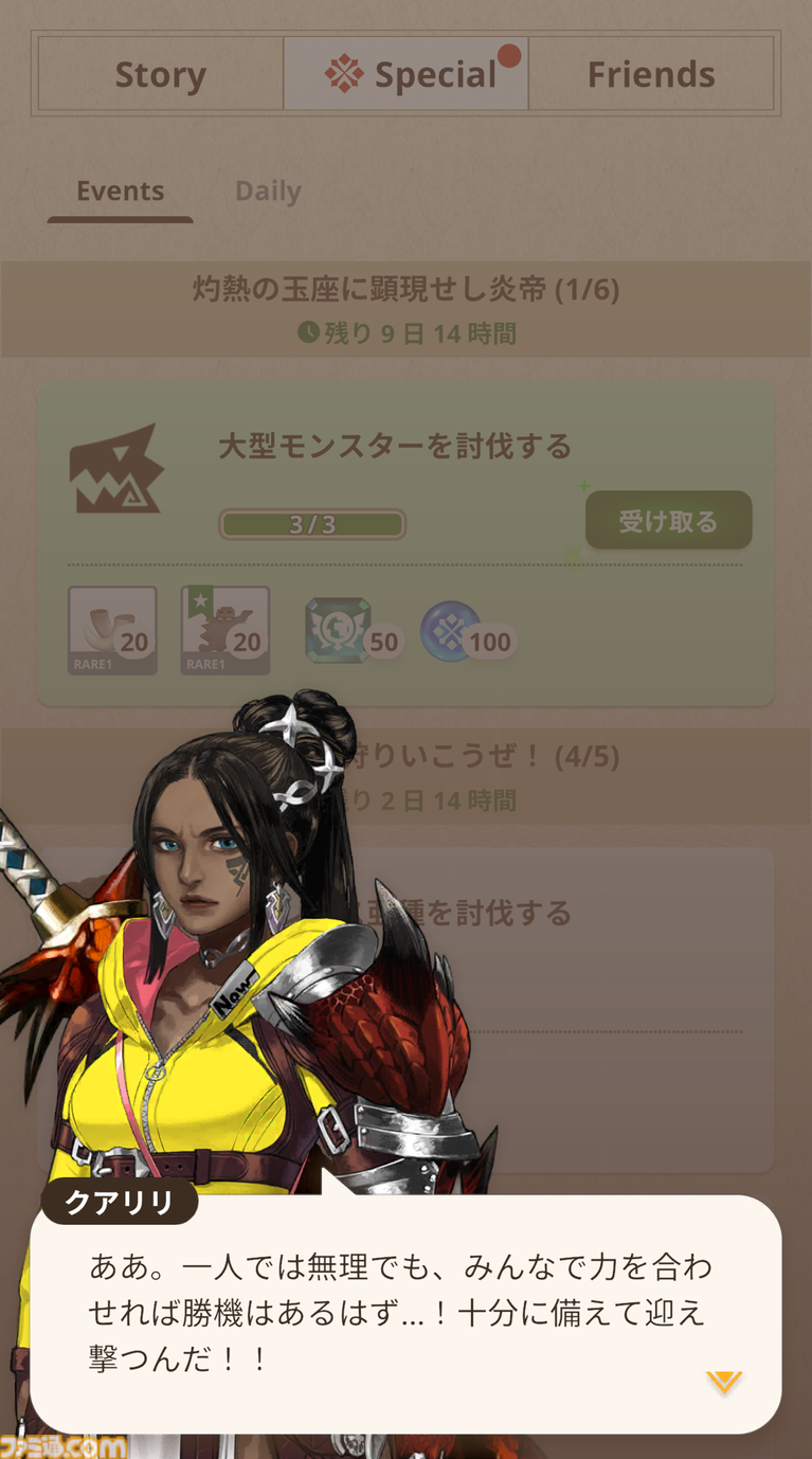 この、炎の古龍の襲来に関してはクアリリさんも遺憾に思っていたらしく、イベントクエスト“灼熱の玉座に顕在せし炎帝”の名で、いくつかのミッションを課せられていた。