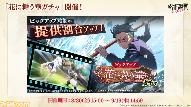 “大刀大立ち回り禪院真希”、“軽やかな呪言師”は、8月30日15時から9月19日14時59分までのあいだに開催される“花に舞う華ガチャ”のピックアップ対象となる。