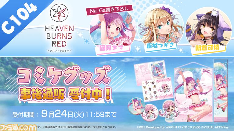 販売アイテムは、「B2タペストリー」「クールタオル」「ミニアクリルスタンド」「缶バッジセット」「クリアファイルセット」で、『國見タマ』『東城つかさ』『朝倉可憐』の3キャラクターそれぞれのアイテムをご用意しております。