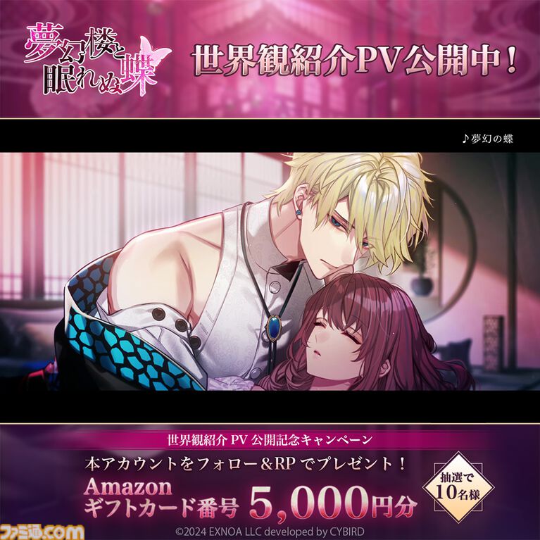 DMM GAMESを運営する合同会社EXNOA(本社:東京都港区、CEO:村中 悠介、URL:https://games.dmm.com/)は、オトナの女性向け恋愛ゲーム「夢幻楼と眠れぬ蝶」において、キービジュアルと一部のキャラクターのボイスがお楽しみいただける世界観紹介PV、本作に出演する声優や一部の登場キャラクターのプロフィールを公開いたしました。また、公式サイトの公開と本作の事前登録が開始したことや、Amazonギフトカード番号が当たるキャンペーンの開催もお知らせいたします。