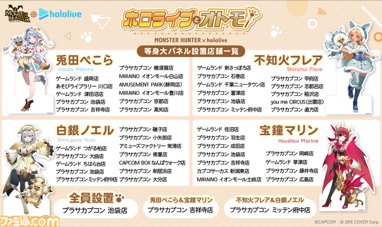 さらに「プラサカプコン 池袋店」ではスペシャルコラボ店舗として「モンスターハンター×ホロライブ3期生」のウィンドウ装飾を展開。さらに3期生の方々による等身大パネルも設置いたします。