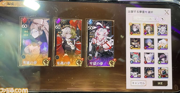 ステージ選択を行うと、続いては実際に戦闘に参加する“夢霊”と呼ばれるキャラクターの中から3人を編成。パーティー編成については、いくつかのパターンを登録できるようになっている。