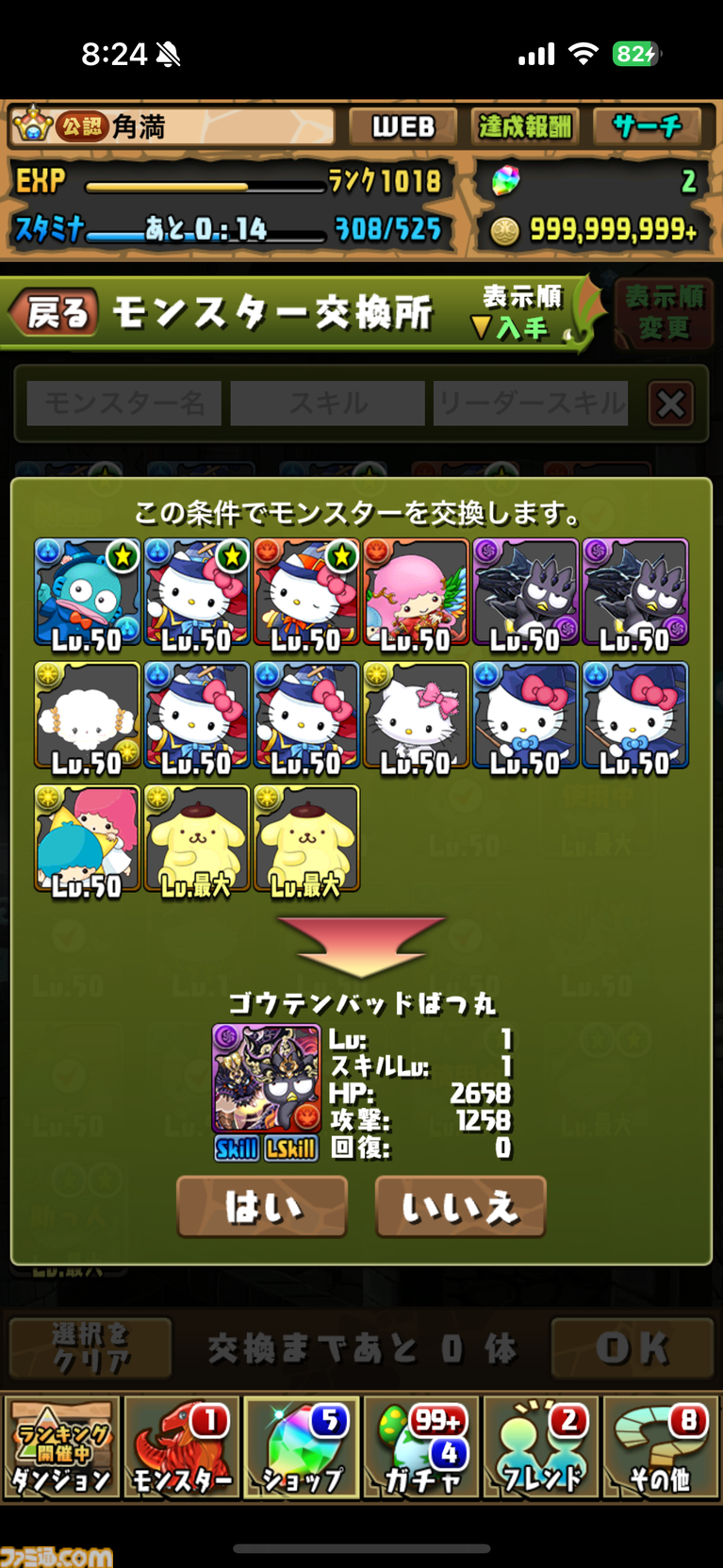 もう仕方ない!!! サンリオコラボのキャラを15体吐き出して、ゴウテンばつ丸と交換しちゃおう!!! そうすりゃボックス内もスッキリするし、目当てのモンスターも手に入るんだから、一石二鳥ってもんだろ!!!