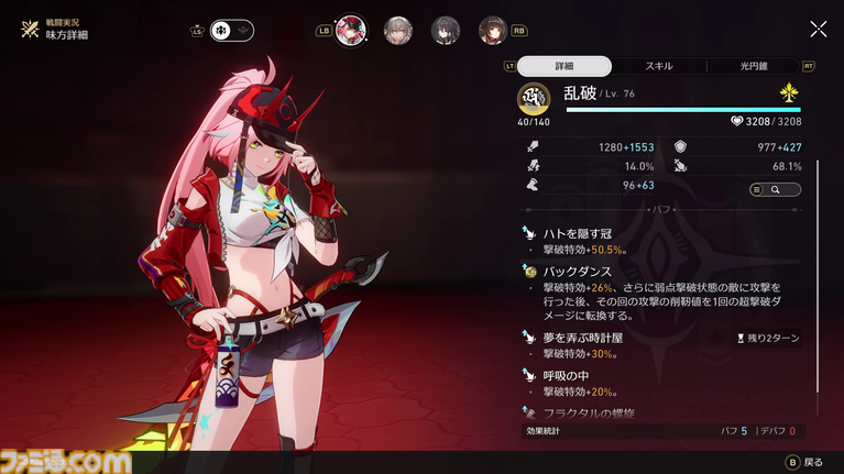 特徴としては、飛霄や黄泉にある弱点属性ではなくても敵の靭性を削る能力を持っていること。そのため、どの戦闘で乱破を採用しても、敵の弱点を気にすることなく立ち回ってくれる。とくに高難度コンテンツ・虚構叙事での活躍が大いに見込める。