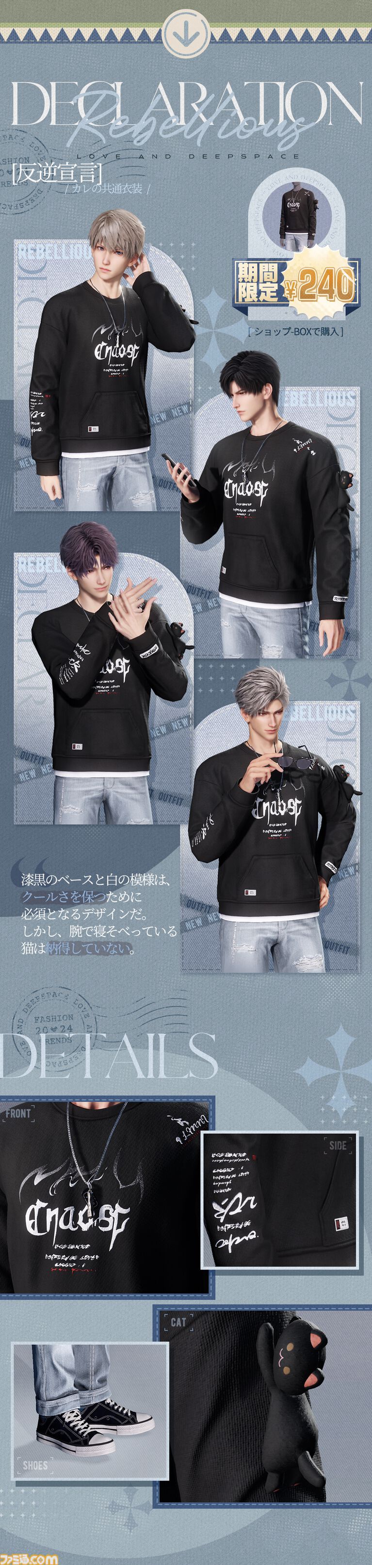 カレの共通普段着【反逆宣言】、【余暇の時】、「私」の普段着【クール宣言】が追加されます。