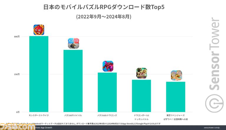 以下、プレスリリースを引用日本のモバイルパズルRPGはモンスト、パズドラ、ドッカンバトル、パズサバの4強状態が続き、日本発の3タイトルは若い男性からの支持が際立つ