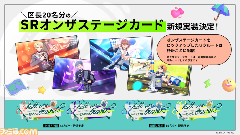 『18TRIP Cassette #06・#07・#08・#09』は、各班の区長フィーチャーイベントのおもてなしデュオ曲2曲が収録されるほか、初のキャラクターソロ曲の収録が決定。
