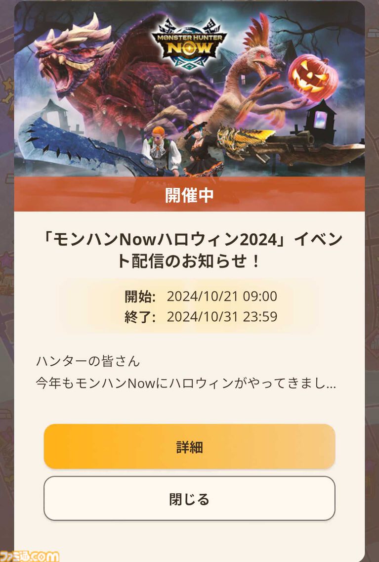 ハロウィンイベントって、2023年9月にリリースされた『モンハンNow』にとっては初めての季節イベントだったので、当時から遊んでいるベテラン勢は思い入れが強いのだ。俺も、1日に20000~30000歩をノルマに歩いていた1年前の当時を遠い目で思い出しながら、