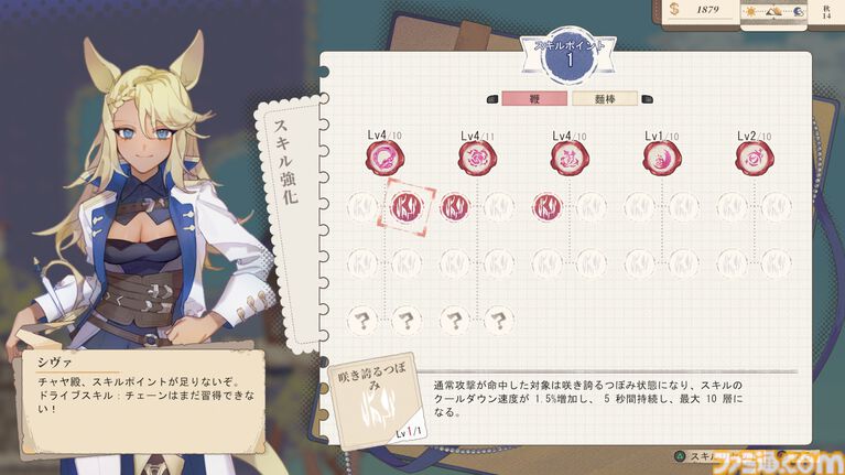 なかでも紹介したいのは“パンエナジー”。パンを売ってパン屋の人気度が上がると獲得でき、消費すれば攻撃力・防御力アップや素材獲得量アップといったバフを得たり、ダンジョンでやられても復活することができます。