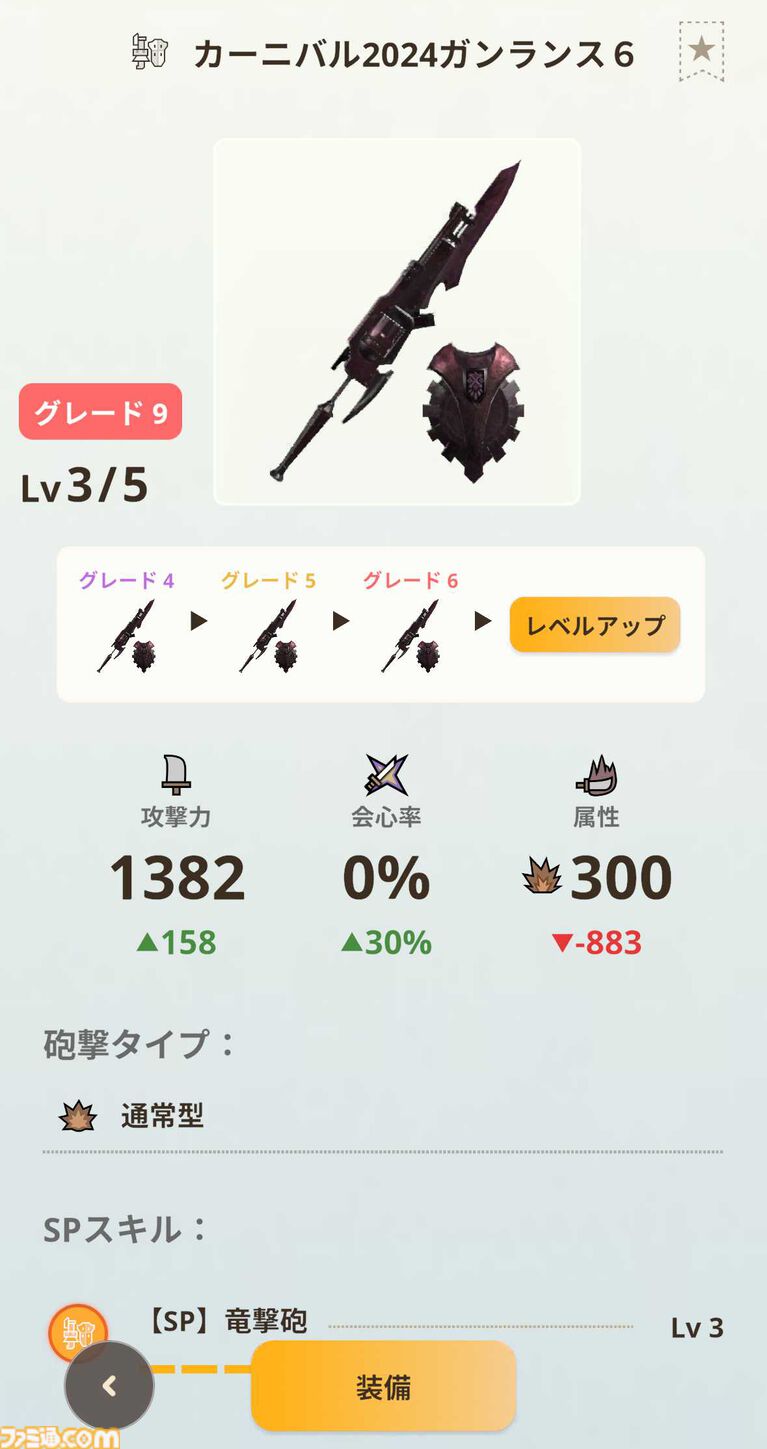 見れば『モンハンNow』のガンチャリオットは、火属性を纏っている。俺的にはやはり、“ガンチャリオット=龍属性”というイメージが強いんだけど、龍属性に関してはジョーガンランスで事足りているので、これは返って渡りに船の措置でありました。こいつを、最終的にグレード10まで育てると……!!
