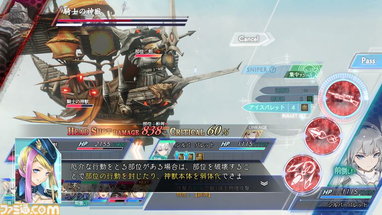 壁となる敵が出現するまではオートに任せて手軽に進めるが、神獣のように部位破壊ができる敵との戦いではどの部位から攻めていくか、それとも敢えて部位をスルーして本体の撃破を狙うか、といったコマンドバトルらしい判断も楽しめるだろう。