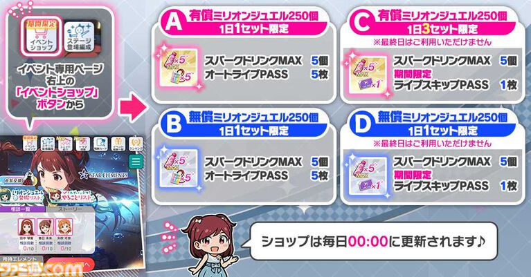 イベント専用ページの「イベントショップ」ボタンから、「スパークドリンクMAX」5個と「オートライブPASS」5枚や「期間限定ライブスキップPASS」1枚セットを毎日数量限定でご利用いただけます。