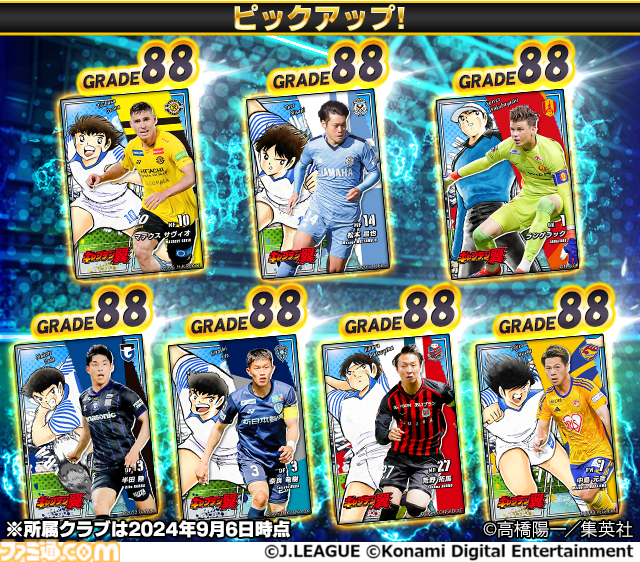 主人公の「大空翼」をはじめとする、「岬太郎」、「日向小次郎」、「松山光」、「次藤洋」、「早田誠」、「若林源三」の7キャラクターと、Jリーガーの選手40名とのコラボカードが登場。コラボカードはキャラクターの必殺技をスペシャルスキルとして所持しています。