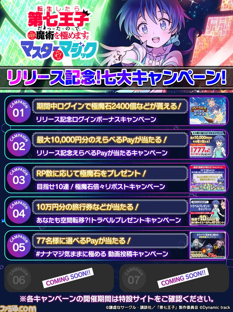 株式会社Dynamic track(本社:東京都港区、代表取締役:佐田 大祐、以下「Dynamic track」)は、シリーズ累計670万部を突破し、TVアニメ化された人気作品『転生したら第七王子だったので、気ままに魔術を極めます』の初の公式スマートフォンゲーム『転生したら第七王子だったので、気ままに魔術を極めます マスターオブマジック(略称:ナナマジ)』が本日12月11日(水)より配信開始したことをお知らせいたします。