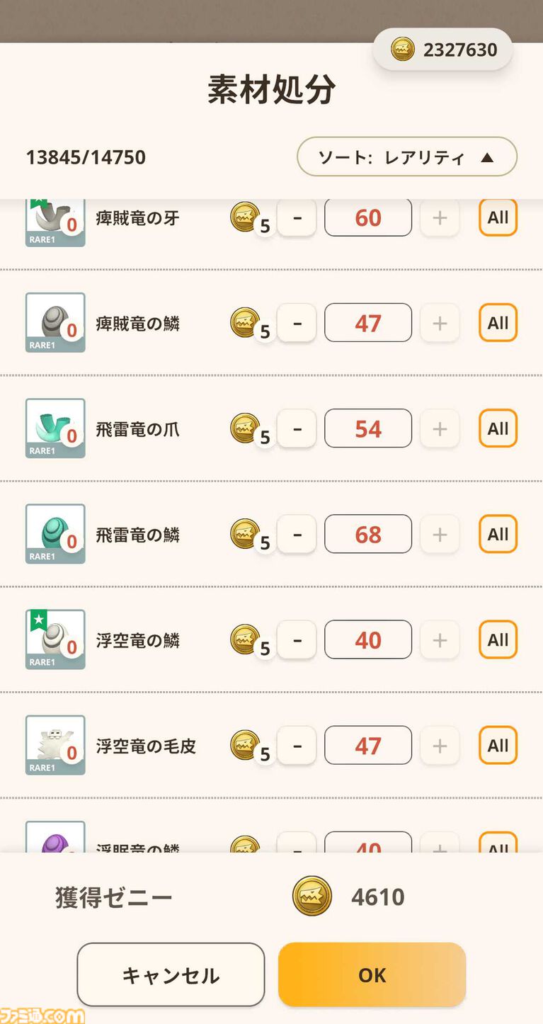 直近では使わない(と思われる)モンスターの素材を、100個残し、50個残しなんていう日本人的なキリ番で温存することすらせず、オールインの根こそぎ売却をやっちまっているのだ!!www