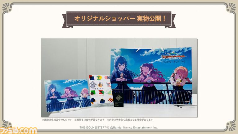 花海咲季、月村手毬、藤田ことねが描かれた『学園アイドルマスター』のショッパー&ノベルティセットを配布。グッズの販売は行われない。