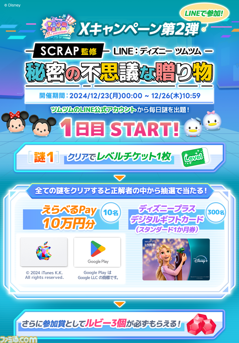 SCRAPが監修した4つの謎をクリアした方、全員にゲーム内アイテム「ルビー」、さらに抽選で「えらべるPay 100,000円分」や、「ディズニープラス デジタルギフトカード(スタンダード1か月券)」をプレゼントします。
