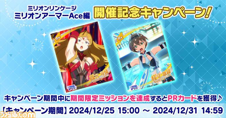 キャンペーン期間中に期間限定ミッションを達成すると、「ミリオンリンケージ ミリオンアーマーAce編」オリジナルイラストのPRカードを獲得することができます。