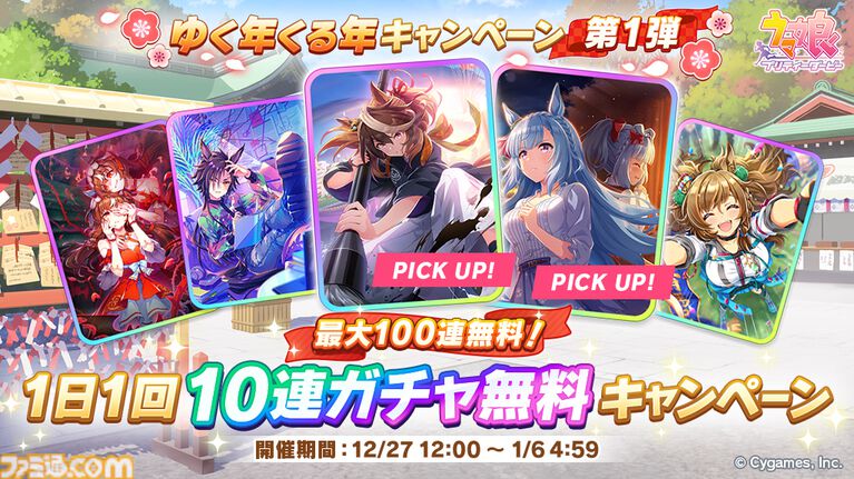 Cygamesから配信中の『ウマ娘 プリティーダービー』にて、2024年12月27日より“ゆく年くる年キャンペーン”が開始。1日1回10連無料ガチャやジュエル最大4950個がもらえるログインボーナスをはじめとした多数キャンペーンが実施中だ。