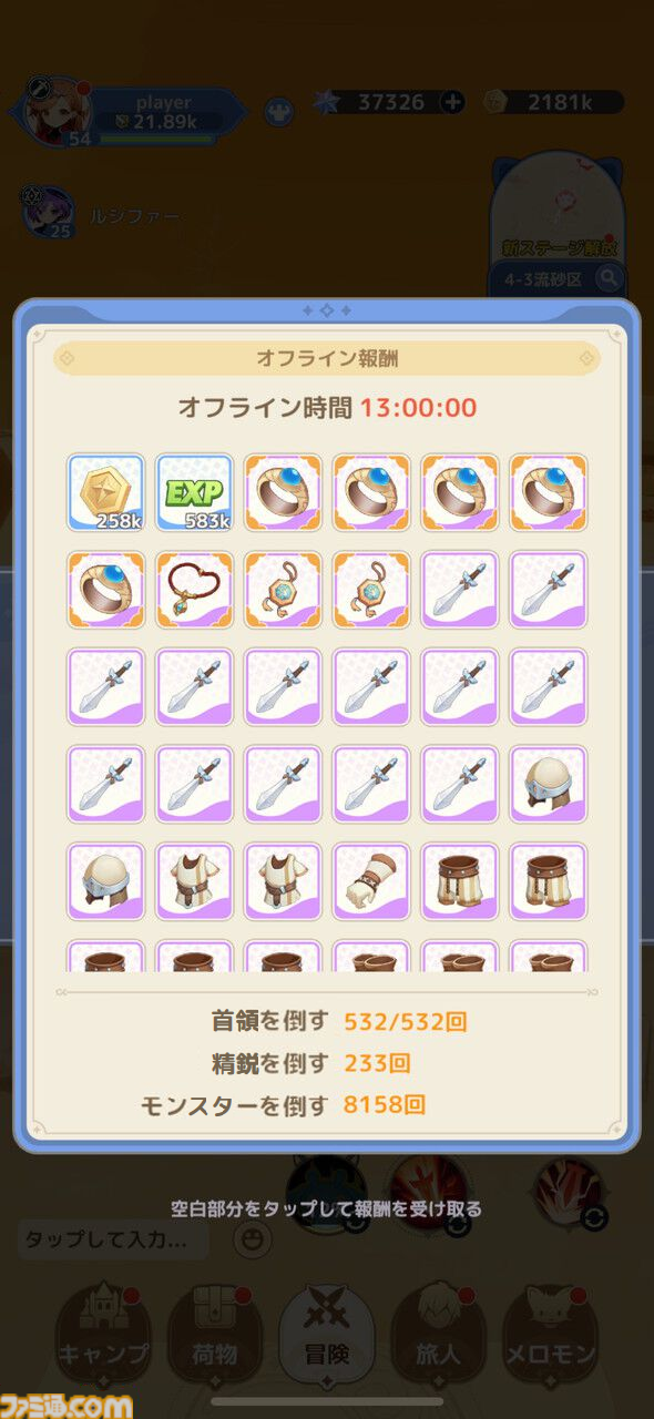 基本的には放置戦闘も選択したステージ内で進行し、本アプリをプレイしていないときのオフライン報酬も、ログイン時に獲得できる。
