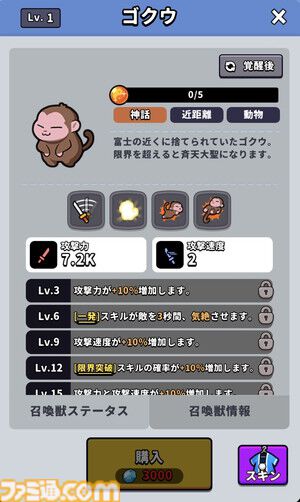 ゴクウは25%(レベル12で35%)の確率で限界突破して強くなる代わりに、失敗すると消滅するキャラです。攻撃が魔法ダメージなので、限界突破すれば安定して強いのが特徴ですね。いまはショウタが流行っていますが、今後ゴクウが流行ることもあると思います。韓国版では、斉天大聖ゴクウと同様の性能を持ったキャラを並べて戦うのが一時期に流行っていたそうですよ。