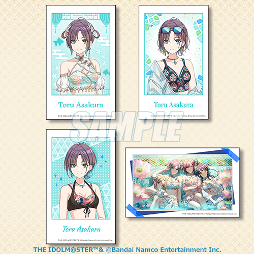 商品は水着衣装に身を包み、ユニット別スタイルブックの表紙にもなった「浅倉 透」「樋口円香」「福丸小糸」「市川雛菜」の特大タペストリーやアクリルスタンドのほか、バッグの中身ページで紹介されたアイドルたちが持ち歩いている愛用品のイラストを使用した3個セットのアクリルミニチャーム、ゲーム内で使用された歴代の水着イラストやカードイラストを使用したミニブロマイドセットやスクエア缶バッジ等、オリジナルグッズを多数展開しております。