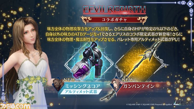 エアリスが装備可能な武器「ガンバンテイン」が期間限定で登場し、バレット専用アルティメット武器「ミッシングスコア」の出現率が上昇しているガチャを開催!