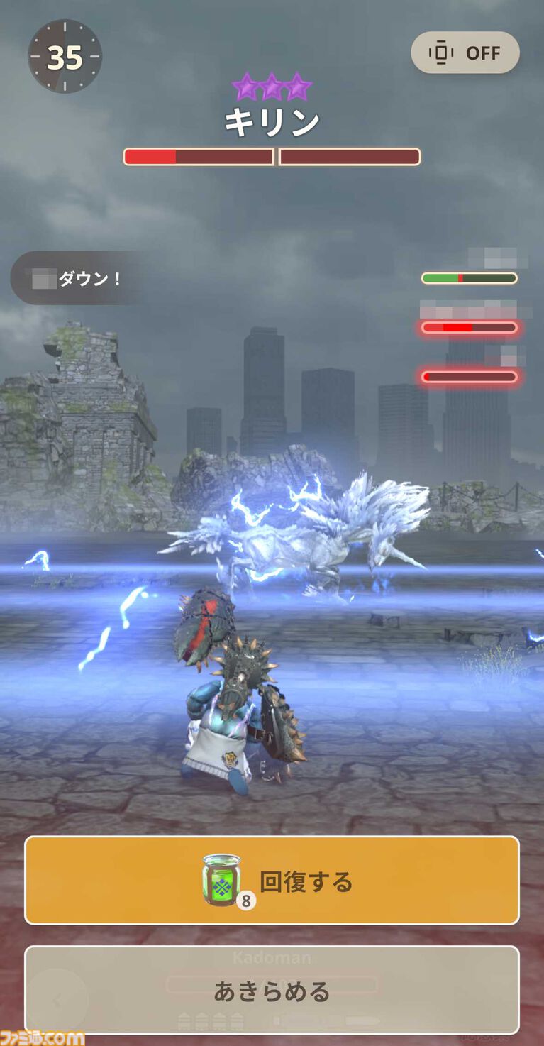 自分の体力がゼロになり、回復するまでのタイムロスは……『モンハンNow』の刹那の狩猟だと、致命傷になることが少なくない。とくにこの1回目のキリン戦は俺だけでなく、ほかのハンターも慣れていなかったようで、狩場のアチコチで、