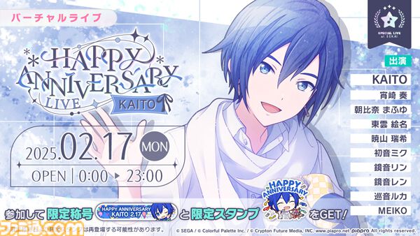 これを記念して、2月17日(月)にゲーム内のバーチャルライブにて、「HAPPYANNIVERSARYライブ KAITO 2025」を0:00より1時間おきに計24回開催いたします。