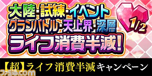 期間中、大陸・試練・イベント・グランバトル・天上界 NORMAL・現代大陸深層・アリーナクエストで消費するライフが半減されます。