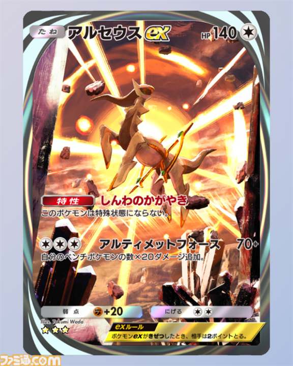本パックの注目カードとなるシンオウ地方の幻のポケモン・アルセウス。カードの効果欄には特別な模様が描かれている。