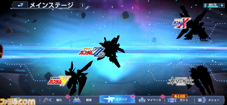 “メインステージ”は『ジージェネ』シリーズにおけるシチュエーションツアーのようなもの。各作品のストーリーに自分が作成した部隊をふたつ配置し、シナリオを追体験しながら戦闘を行っていく。部隊は対象ステージの時代に存在するユニット&キャラクターしか編成できない“シリーズ部隊”と制限のない“フリー部隊”の2種類。ちなみに戦艦ユニットは存在せず、従来作のオプションパーツに似た“サポーター”という要素に置き換わっている。これにより、バフや戦闘中に役立つスキルを使用可能。