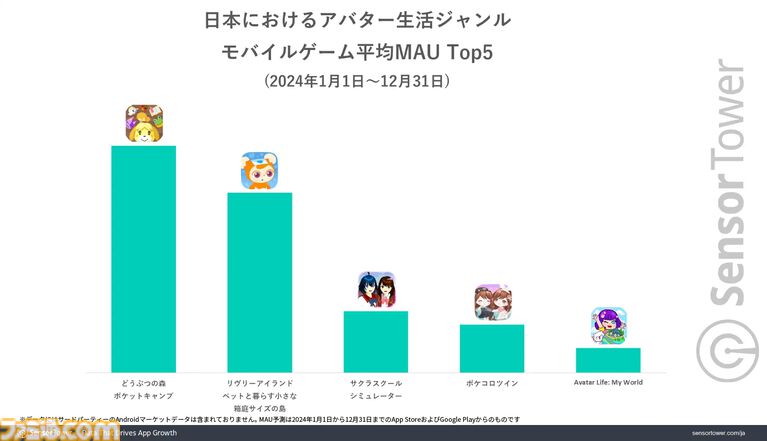 『どうぶつの森 ポケットキャンプ』はアバター生活ジャンルのモバイルゲームとして、日本で大きな支持を得ていました。Sensor Towerのデータによると、2024年1月1日から12月31日までの日本におけるアバター生活ゲームの平均MAUで、同作はトップとなっています。