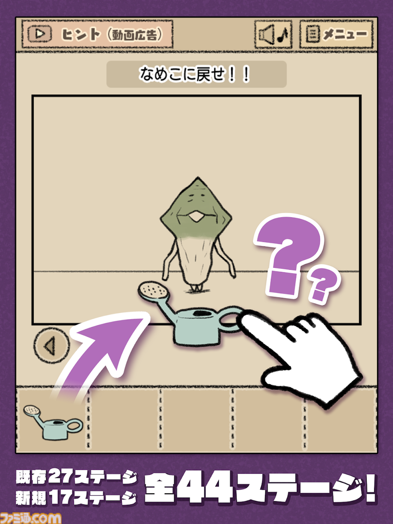 『なめこの脱出ゲーム』は、2018年5⽉にリリースされた『なめよん〜なめこの脱出ゲーム〜』を⼤幅にリニューアルしたアプリです。前作の27ステージに加え、新たに17ステージを追加し、全44ステージが収録されています。